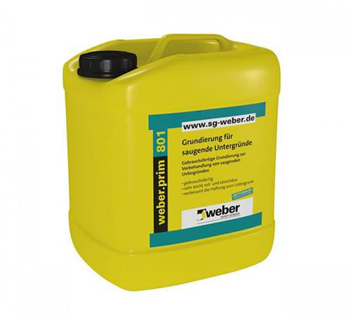 weber.prim 801 ist eine alkalienbeständige, unverseifbare Grundierung mit staubbindender und wasserabweisender Wirkung. Somit können saugende Untergründe, ideal für den nachfolgenden Auftrag von Verlegemörteln, Fliesenklebern, Spachtelmassen oder Putzen vorbehandelt werden.