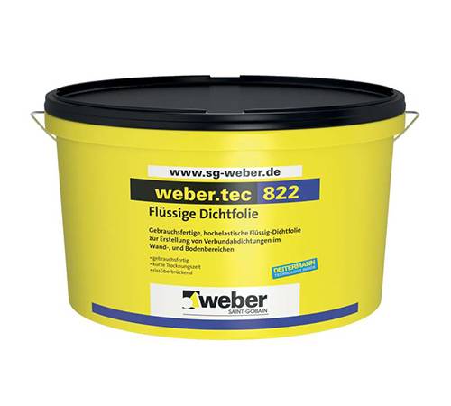 weber.tec 822 ist eine einkomponentige, flexible Flüssig-Dichtfolie zur naht- und fugenlosen Abdichtung unter Fliesen und Plattenbelägen für Feucht- und Nassraumbereiche im Innenbereich. Es schützt feuchtigkeitsempfindliche Untergründe, wie z. B. Gipsputze, Gipsfaserplatten, Gipskartonplatten und Calciumsulfatestriche vor Durchfeuchtung.