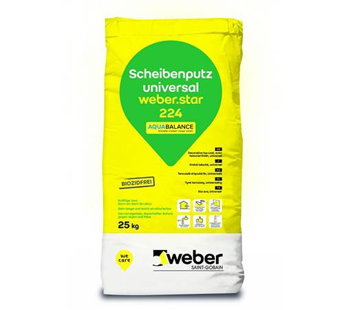 weber.star 224 AquaBalance Scheibenputz ist ein Oberputz für innen und außen auf weber.dur Unterputzen, sowie eine Oberbeschichtung für weber.therm Dämmputz und weber.therm Wärmedämm-Verbundsysteme.