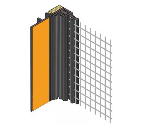 PVC-Bewegungsfugenprofil mit einer koextrudierten flexiblen TPE-Bewegungslasche und beidseitigem Gewebe zur Ausbildung von Bewegungsfugen.